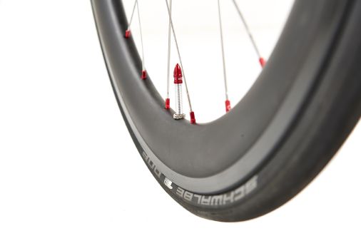 Hand built carbon clincher tubeless-ready rim brake road race wheels. 20h radial front, 28h 2 cross rear.