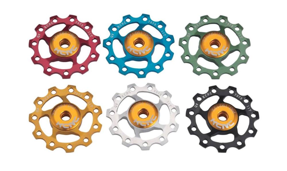 KCNC replacement Jockey Wheels in 6 anodised colours. Beautifully made from anodised cnc machined 7075 alloy with fully sealed stainless steel cartridge bearings and gold anodised dust covers